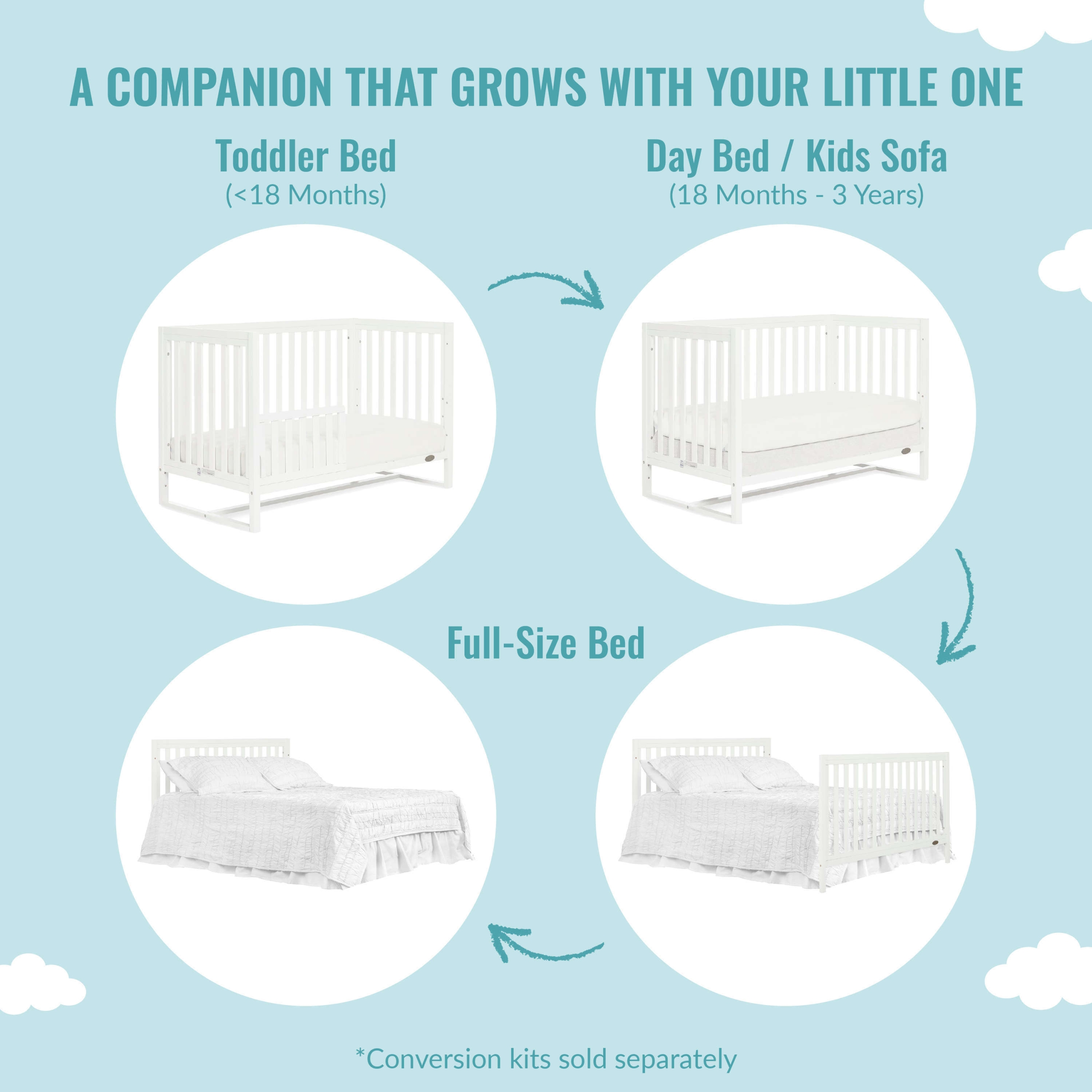 Introducing the Dream On Me Arlo 5 in 1 Convertible Crib which offers a unique but stylish choice for a modern nursery. It features a distinguished base that creates a floating effect for a contemporary look. The adjustable mattress heights allow this crib to grow alongside your little one, starting with the highest level then lower it as your baby begins to sit or stand. The Arlo crib can be converted into a toddler bed, daybed/sofa and full-sized bed (conversion kit, conversion toddler rail and bed rails sold separately). Built of durable, sustainable and renewable New Zealand pinewood, the Arlo design is minimalist and on-trend. Choose from single-tone as well as our dual-tone finishes that complement a variety of nursery and room decor themes. All our cribs are designed with a focus on safety, are BSA verified and meet all applicable ASTM/CPSC standards. All tools for assembly included. For the best fit, we recommend any Dream on Me or Evolur standard, full-size, non-toxic, Greenguard Gold certified crib mattress (sold separately).