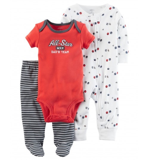 Featuring a coordinating bodysuit, footed pants and sleep & play, he’s cozy from day to night.