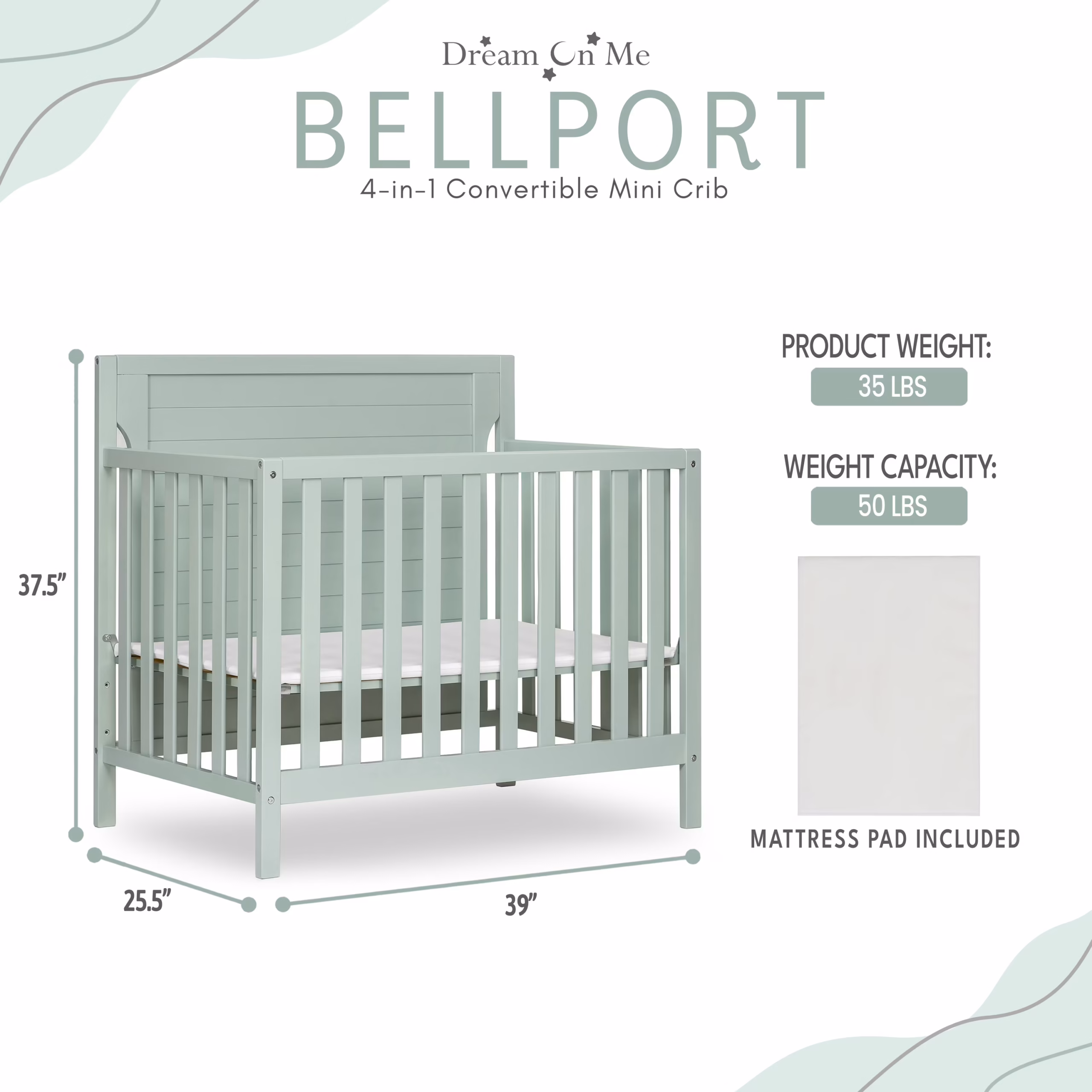• The Bellport 4-in-1 Convertible Mini/Portable Crib is the ideal piece of nursery furniture that you need to match the changing needs of your growing child, while making the most of today’s s compact nurseries. Starting as a mini crib, convert it into a mini daybed and twin-size bed (bed rails sold separately) as needed. The Bellport boasts a clean design vibe. Internally roomy, its compact design means it occupies a small footprint, making it ideal for small nurseries or when you are co-sharing your room with your baby. You can choose from four pleasant non-toxic, child-safe water-based finishes and mix and match with other pieces of furniture and rugs to create a modern nursery. The crib has a 3-position adjustable mattress height setting that you can adjust as your child grows and comes with the regulatory 1” mattress pad. Maximum weight limit – 50 lbs. All tools/assembly instructions included.