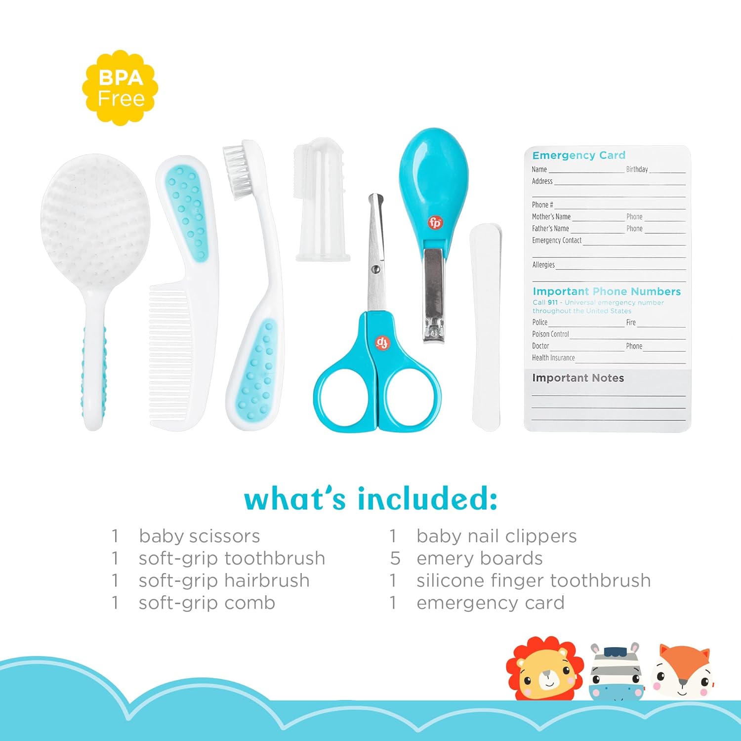 - The Smart Care Fisher-Price 12-Piece Baby Grooming Kit includes scissors, baby nail clippers, 5 emery boards, toothbrush, comb, hairbrush, toothbrush, finger toothbrush, and emergency card. A convenient travel zip case is also included, making it the perfect baby travel essential.