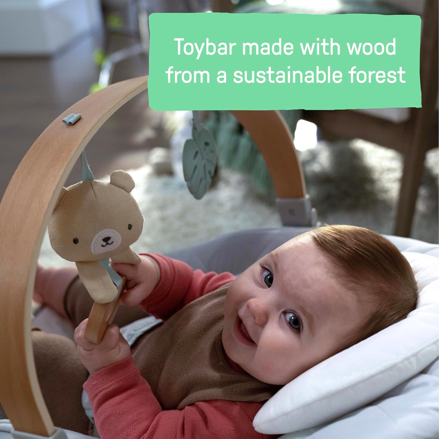 • The chic bouncer comes with a toy arch made with wood from a sustainable forest, Nate the bear plush toy with a natural wood ring, and a silicone leaf-shaped toy