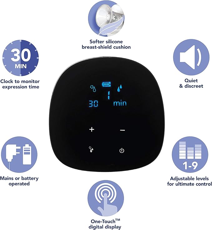 - DIGITAL TOUCH-SCREEN – The light up digital touch-screen display panel perfect for night-time expressing, monitoring expression time & adjusting levels. It comes with a soft silicone shield for added comfort.