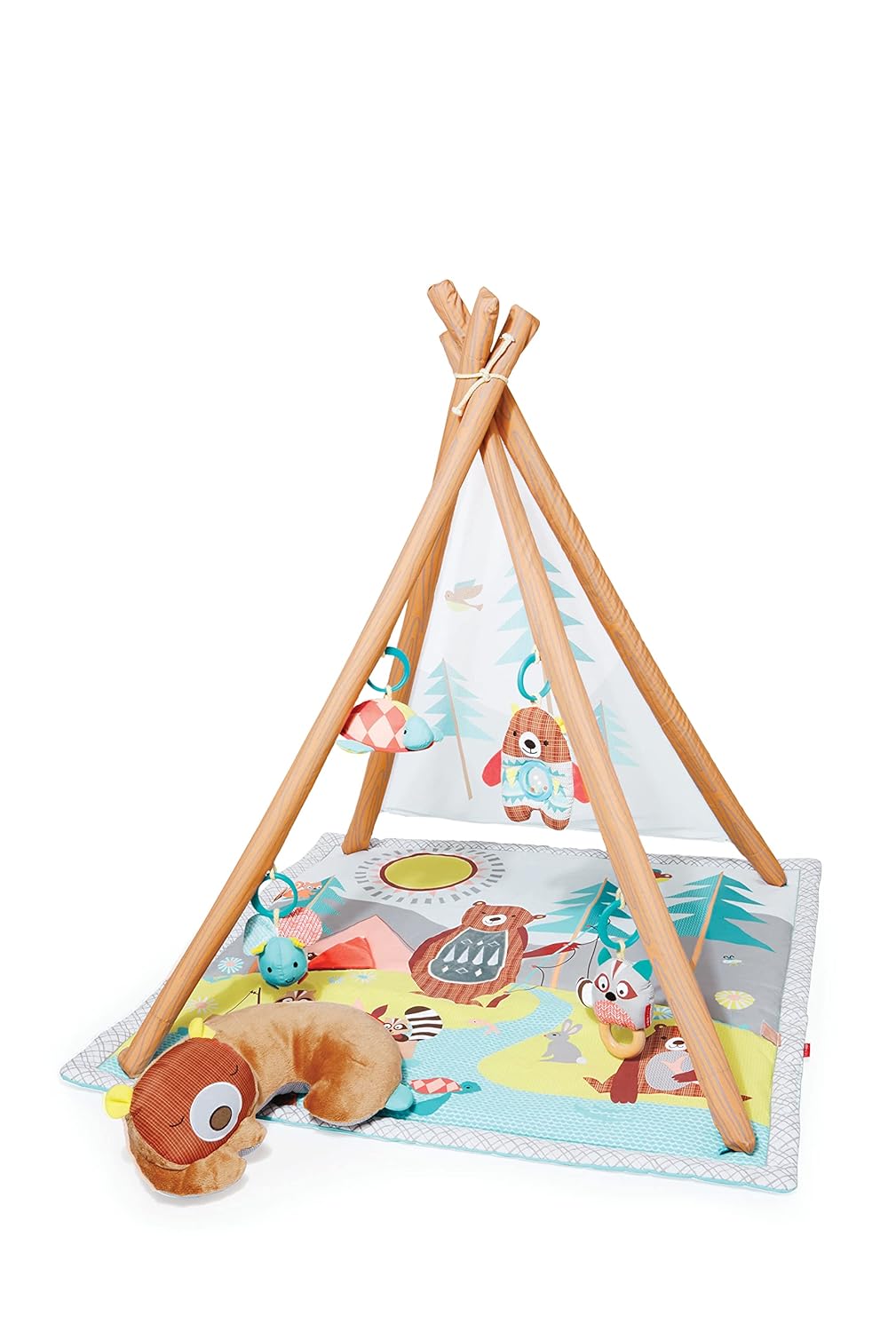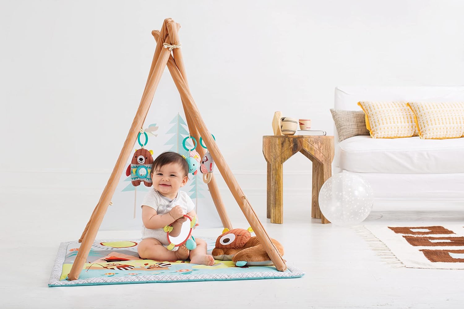 - With a woodgrain-patterned structure, this baby gym has a whimsical outdoor feel. The printed mesh backdrop sets the ultimate campground scene, while the plush, sleeping bear tummy time pillow encourages developmental milestones. A light-up firefly, musical raccoon and other nature friends help to develop baby’s sensory skills.