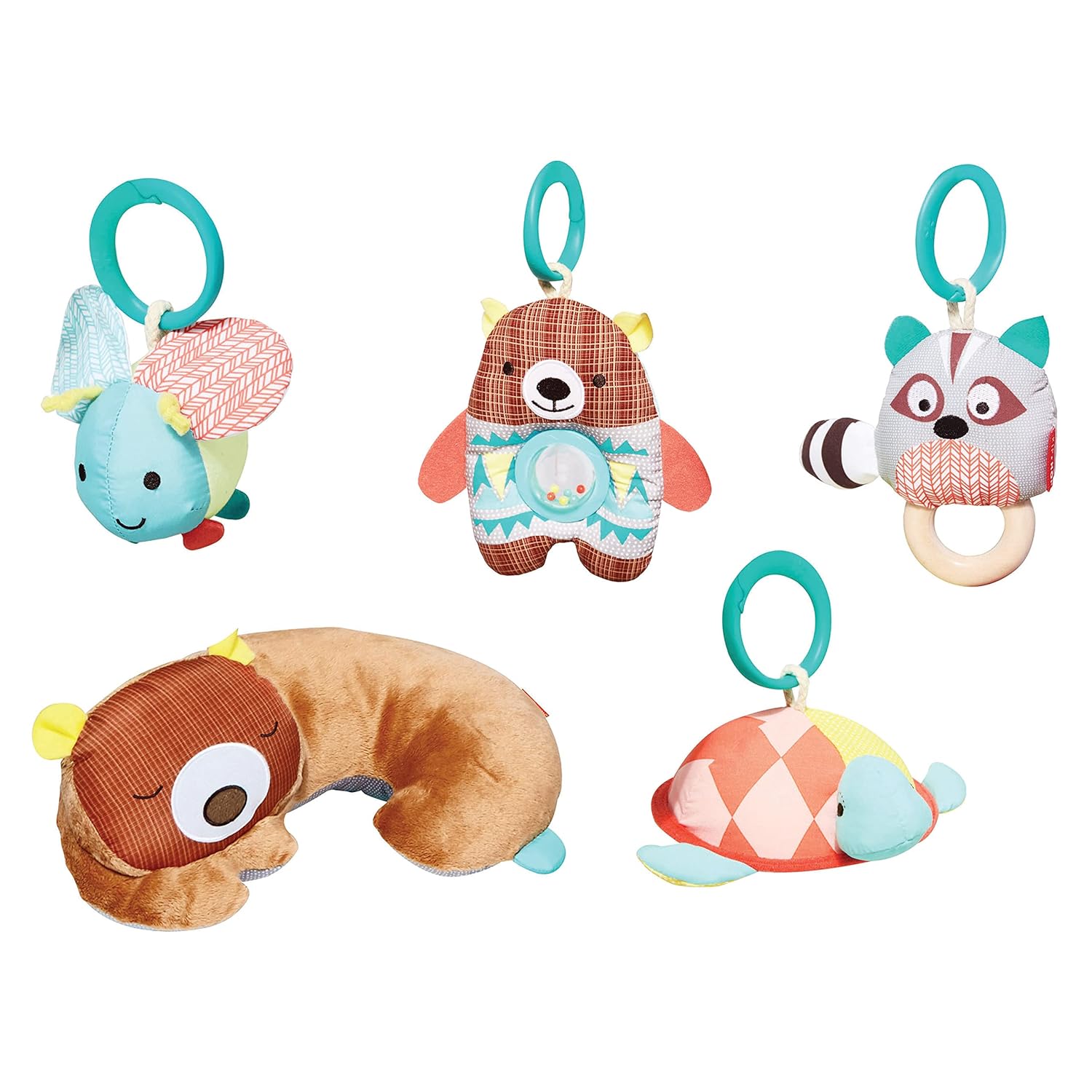 - 17+ developmental activities include: light-up firefly, turtle mirror, bear rattle and musical raccoon with wooden teether toy that plays “Twinkle, Twinkle Little Star”