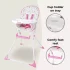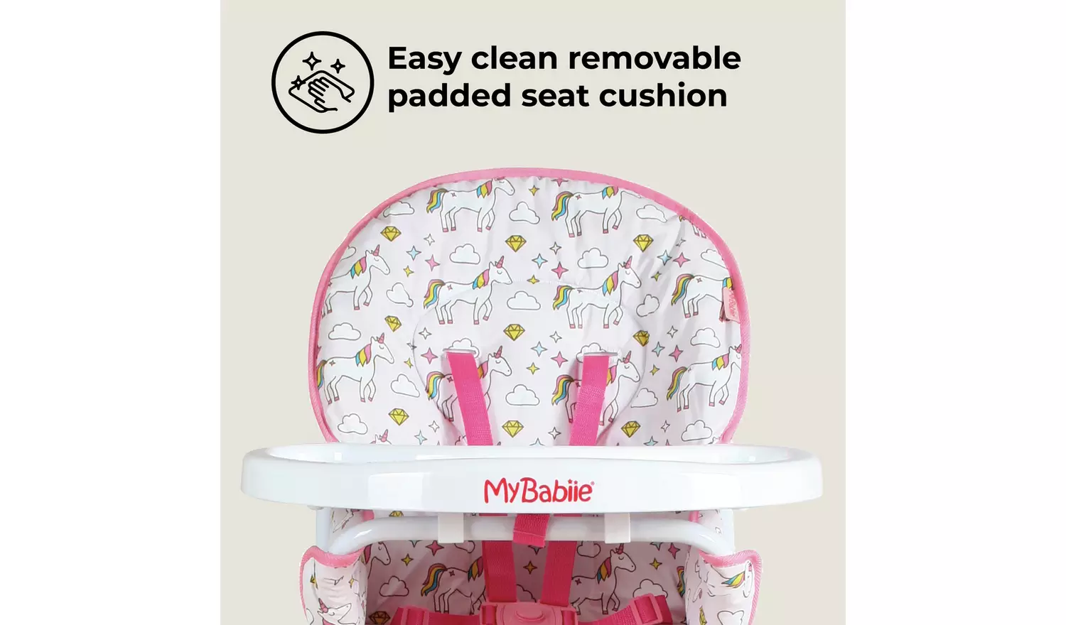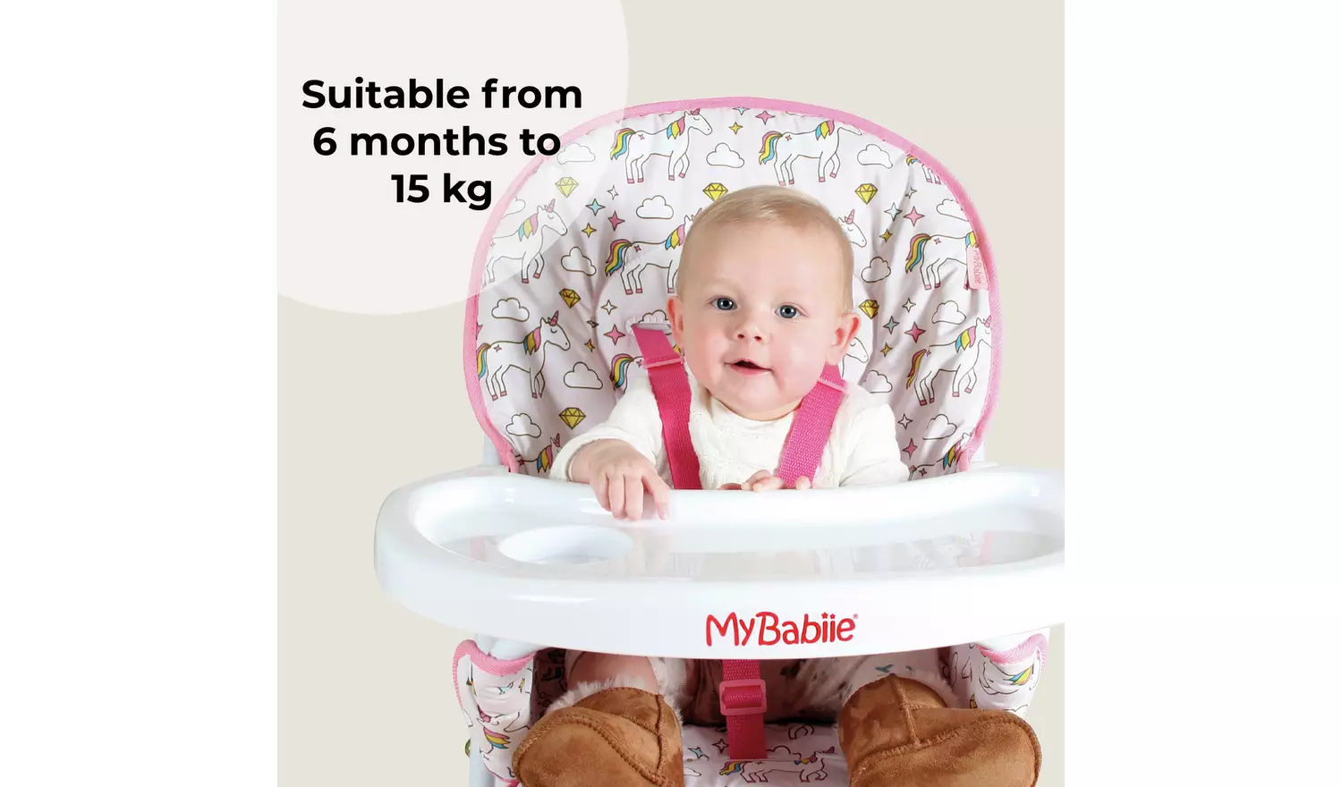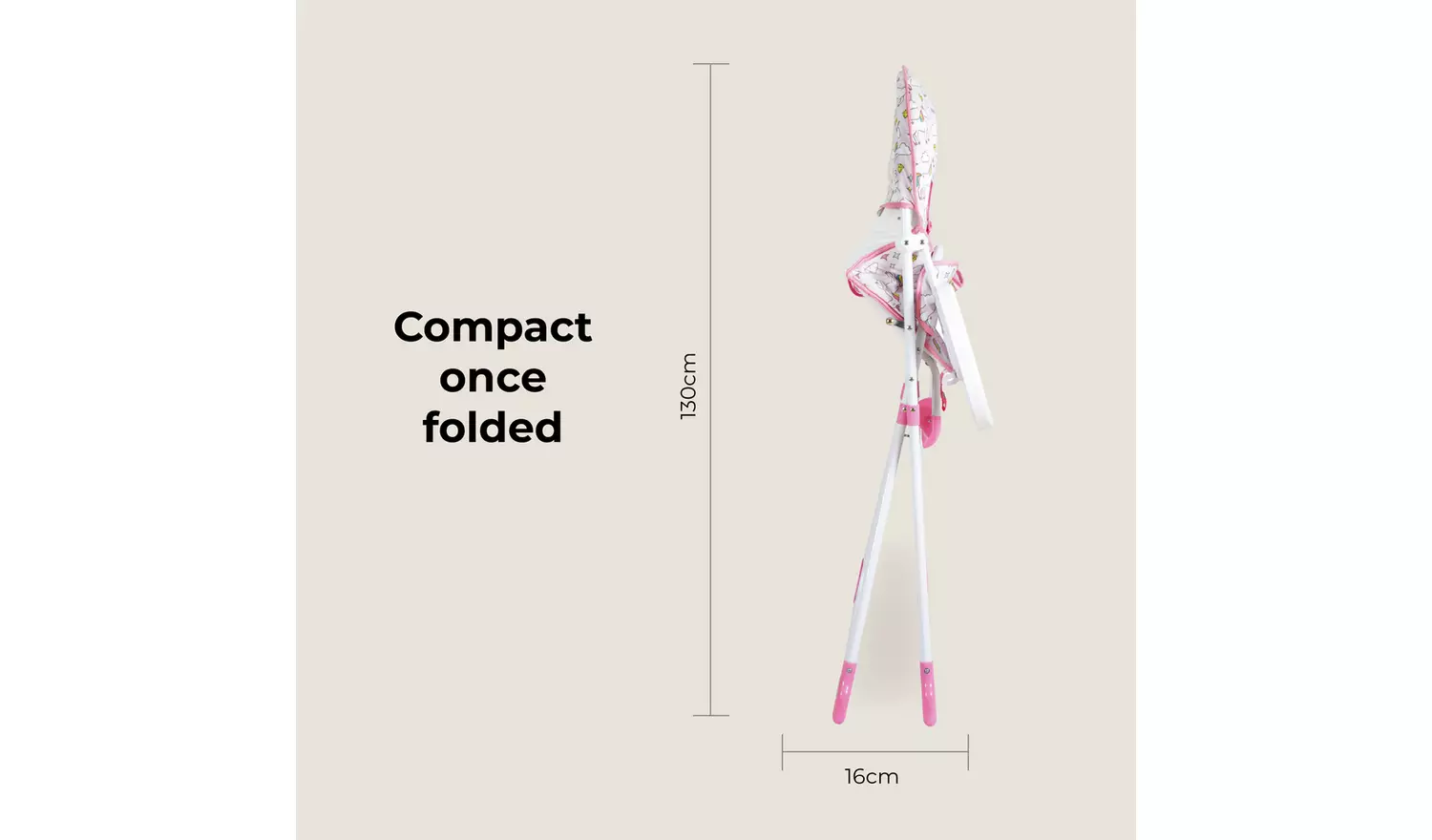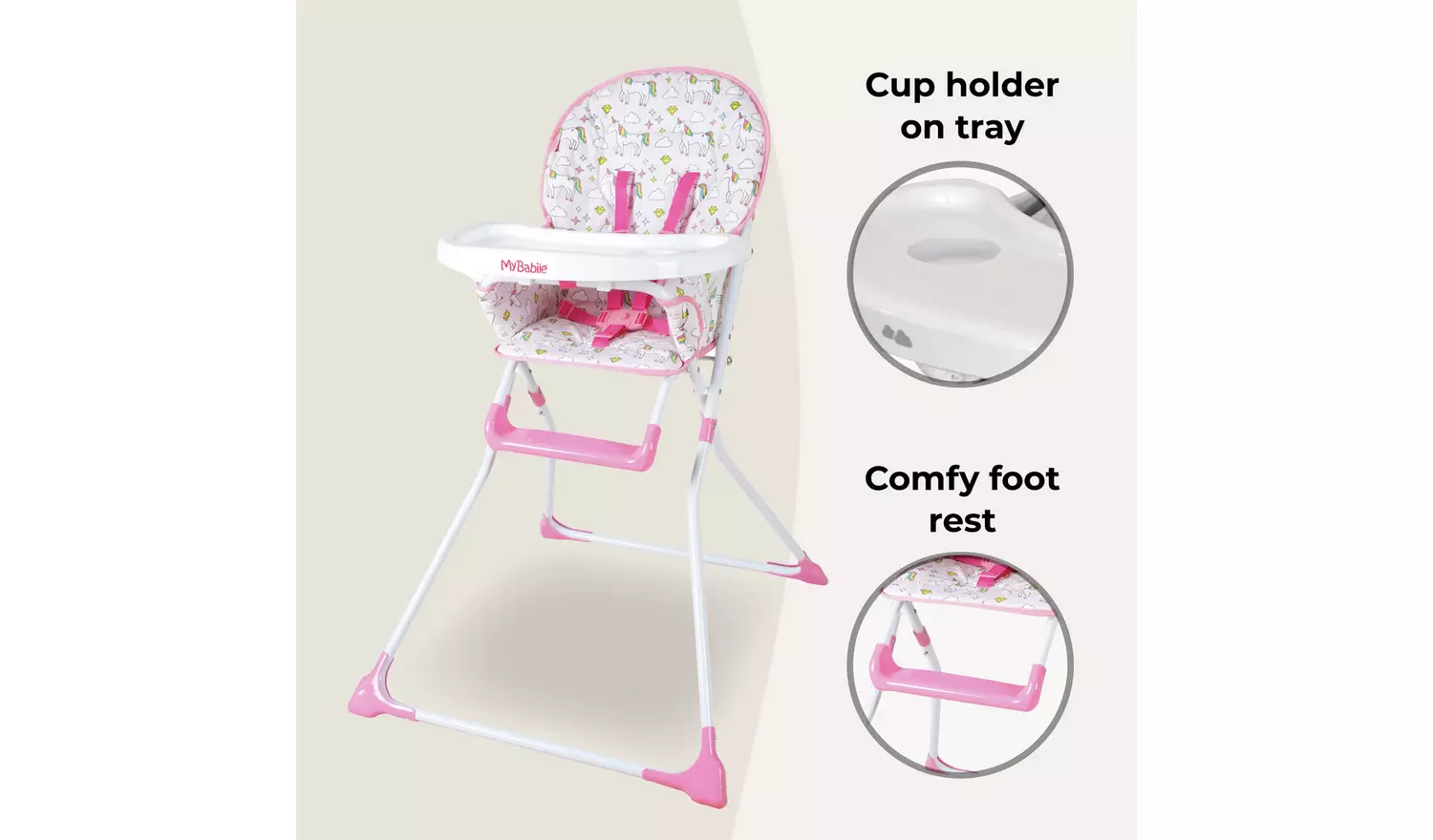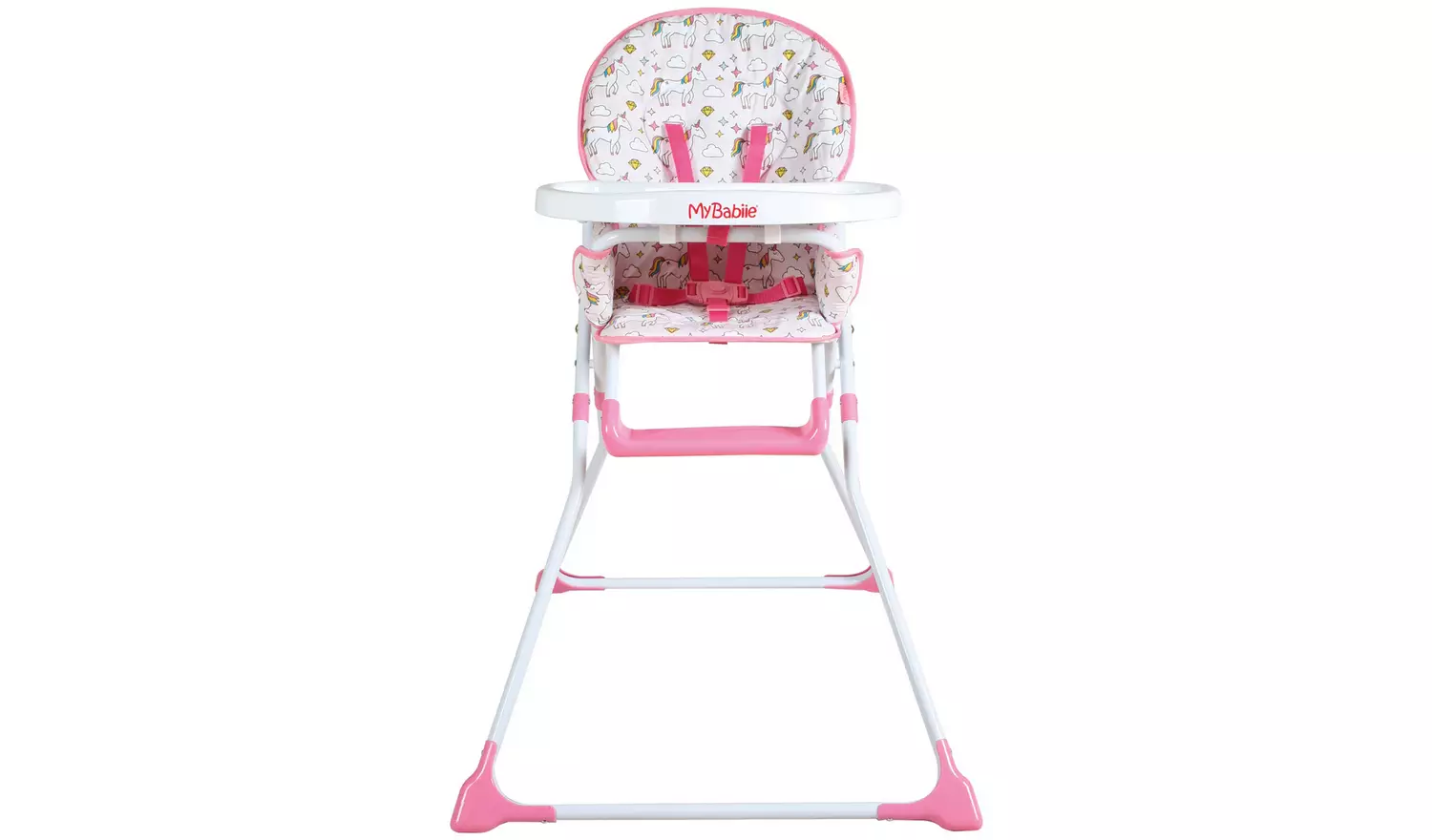 This stylish compact unicorns highchair is ultra lightweight and suitable for any occasion. The padded seat with a five-point harness not only looks great but is super comfy and can be wiped clean easily after use. On the tray is a handy cup holder and a foot rest means your little one is comfy for mealtimes. After use, this highchair can be folded and stored out the way with ease.